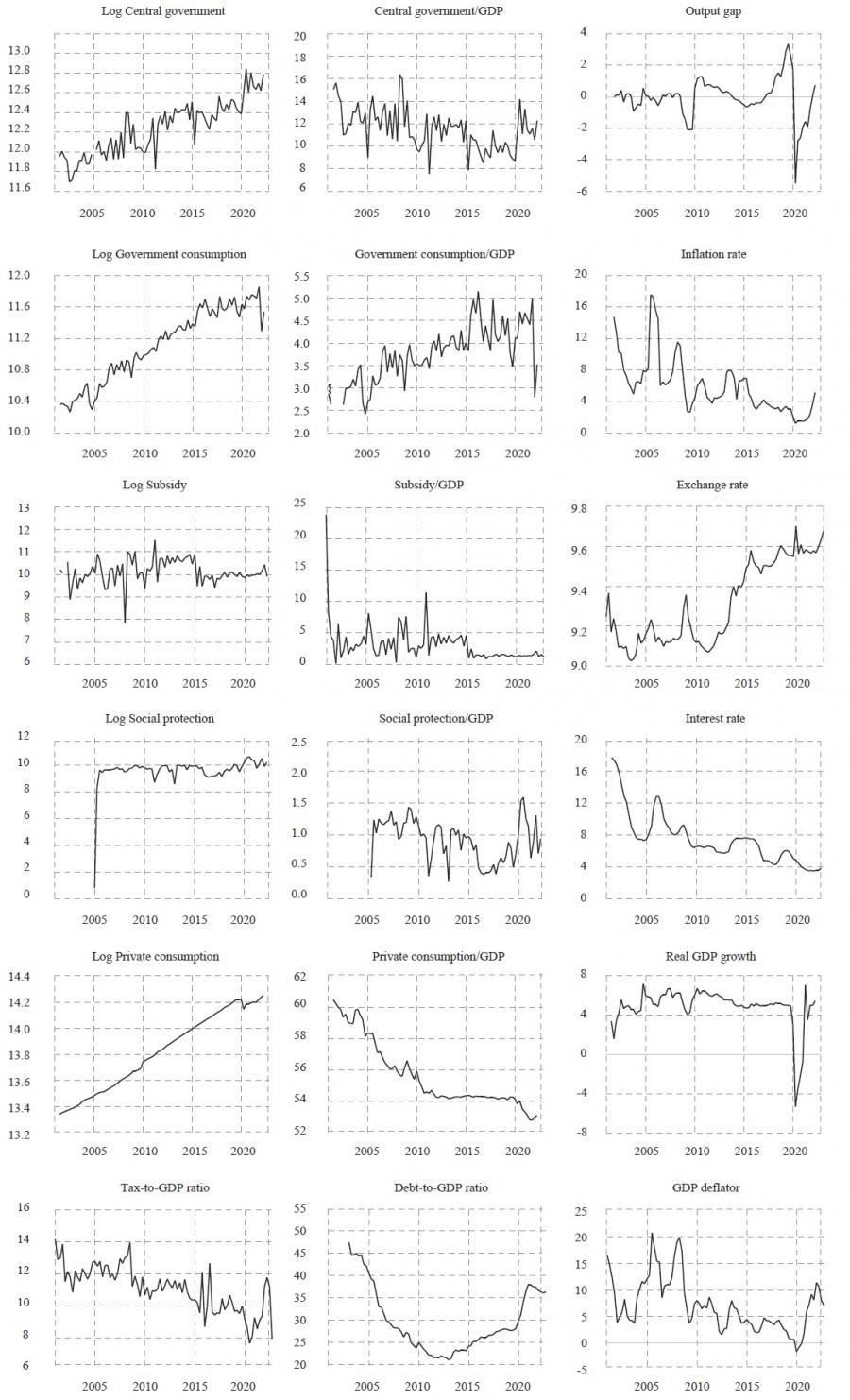 To analyse the dynamic effects of central government spending on inflation and economic activity in Indonesia with an SVAR model, quarterly data from 2001:Q1 to 2022:Q4 are used. Earlier observations in this period are rebased to constant 2010 billion rupiahs to get a longer time series for national accounts. The variable output gap is derived by extracting the trend component of GDP using the HodrickPrescott filter. All series with the exception of output gap, inflation rate, interest rate, debt ratio and tax ratio are expressed in logarithms; nominal values are deflated with the GDP deflator, obtained from the ratio of nominal to real GDP at 2010 prices. Data definitions, sources, and summary statistics are shown in appendix tables A1 and A2. Graph 1 shows the main data series adjusted for seasonality using the US Census X-13 method.