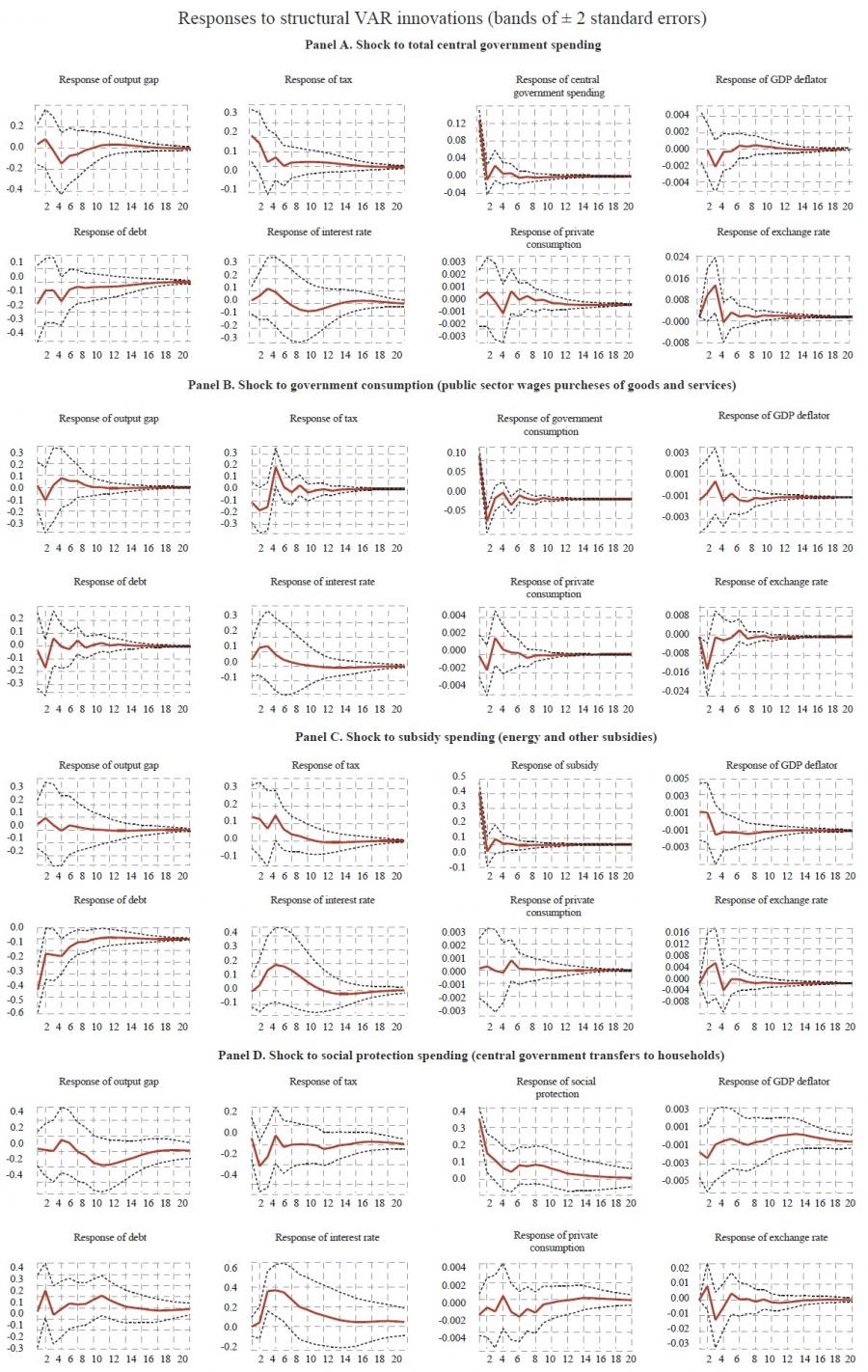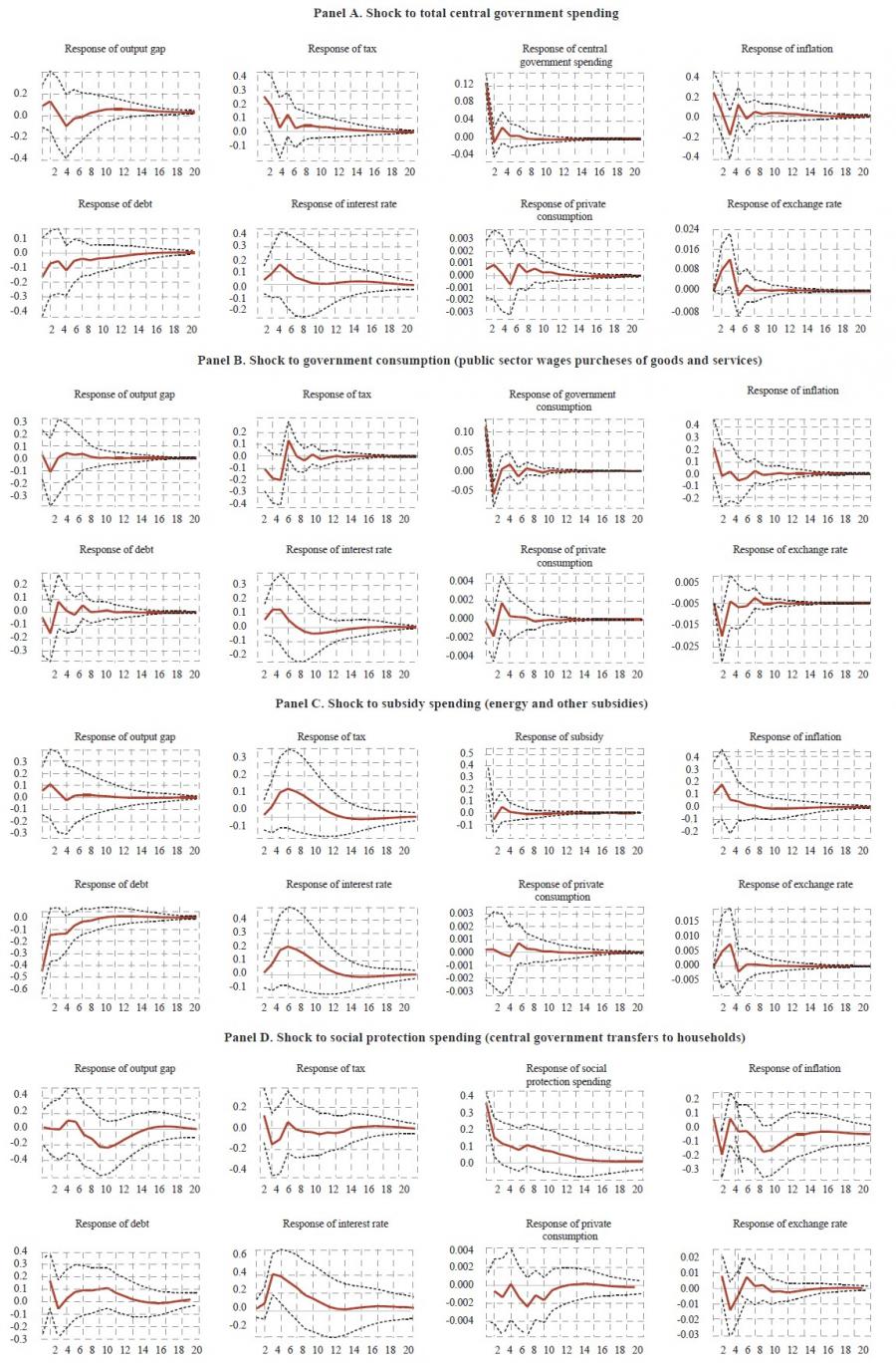 The structural VAR model used in this paper consists of eight endogenous variables: exchange rate (ER), output gap (GAP), tax revenue to GDP ratio (TAX), government spending components (GOV), inflation rate (INF), debt-to-GDP ratio (DEBT), interest rate (INT), and private consumption (PC). Four models of government spending shocks are estimated: a baseline model of total central government expenditure (CG); government’s own consumption (GC), i.e., spending on public sector wages and government purchases of goods and services; social protection spending, i.e., transfers to households for social protection (SP); and spending on energy and other subsidies (SUB). The model for policy shocks is specified as: