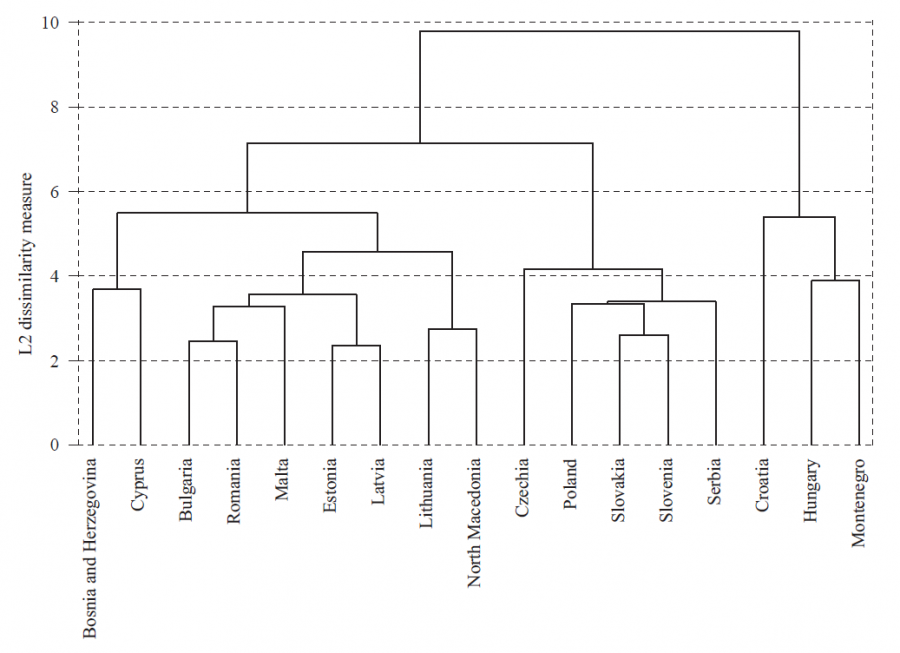 We merge the countries of interest with a set of EU-13 countries5 to perform a cluster analysis and test whether common patterns in financial efforts made in the different areas of expenditure can be detected. Hence, the final sample includes 17 countries, of which 13 are new EU member states. The remaining four are former Yugoslavian countries, while Slovenia and Croatia are listed among the new EU member states since they joined in 2004 and 2013, respectively. We focus on both total expenditure and its disaggregation in 10 functions.6 In all cases, figures are expressed as a share of GDP. If common patterns among former Yugoslavian countries are strong enough, the existence of a cluster inside the pool should be reflected, despite the difference in degrees of EU integration among former Yugoslavian countries. The computations were made using the Stata 14 statistical package.
