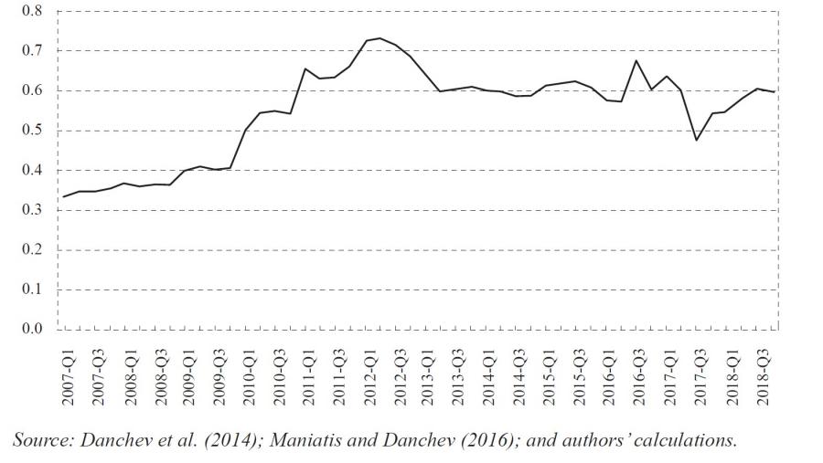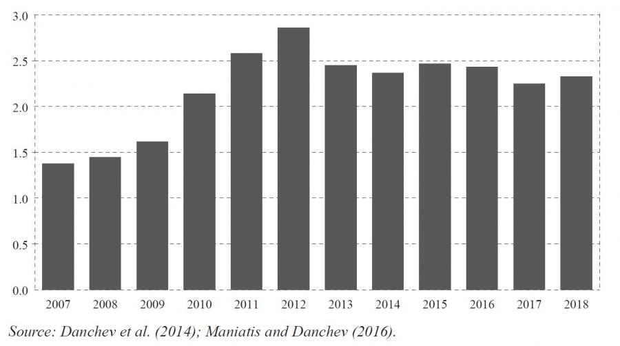 Table 1 shows the changes in the minimum excise duty on cigarettes and fine-cut tobacco between 2007 and 2018 (Gov. Gazette 265A/2001; 169A/2006; Danchev et al., 2014; authors’ calculations), according to the Article 8(6) of Directive 2011/64/EU; figure A3 shows the composition of the final price of tobacco products as a percentage of the original price, the excise duties and the VAT between 2007 and 2018 (Maniatis and Danchev, 2016). It is clear that total taxes (excise + VAT) account for approximately 86% of cigarettes’ final price.