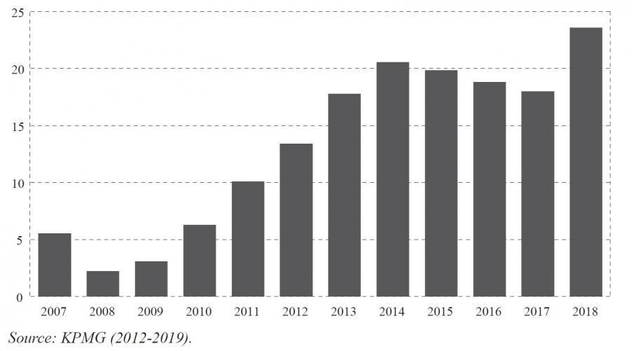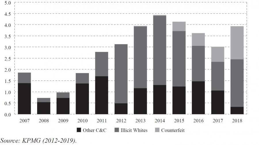 Tobacco smuggling also includes the following: (i) counterfeiting that duplicates well-known brands that are produced without the legitimate owners’ permission with the intention of cheating consumers and avoiding the payment of duties and (ii) illicit whites, with legally manufactured cigarettes in one country but smuggled and sold to another without duty payment. This category represents a significant proportion of the illegal cigarettes circulating with a cost not exceeding one euro per package. Figure A2 illustrates the development of cigarette’s smuggling in the EU (KPMG, 2012-2019).