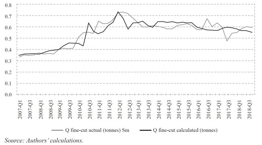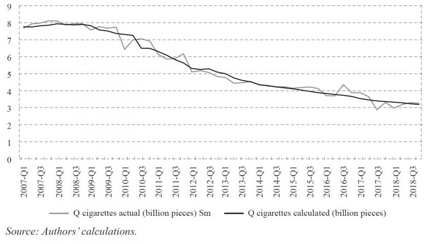Data for the linear regression represented by equations 4 and 5 comprise the dependent variables, namely, demand for (consumption of) cigarettes, Qc, and fine-cut tobacco, Qf, from the annual data available from the Greek Ministry of Finance (see figures A5 and A6), distributed according to the state’s revenues from excise duties on tobacco products for each three-month period (see figure A8) and smoothed using the moving average method (see figures A13, A14, A15).