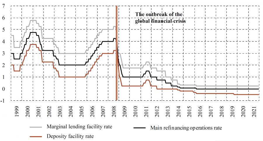 Figure 1ECB’s key policy rates (in percent) DISPLAY Figure Although the sovereign debt crisis had subsided by 2013, economic growth remained modest and inflation continued to edge down. In order to facilitate the recovery and bring the inflation rate closer to its target, the ECB pursued a highly expansionary monetary policy, which continued until the end of the decade, and beyond (figure 1). The key policy rates were brought to below zero, banks were supplied with ample, low-cost funding through the longer-term refinancing operations, and a large-scale asset purchase program was introduced in early 2015 in an attempt to reduce borrowing costs more directly. 1