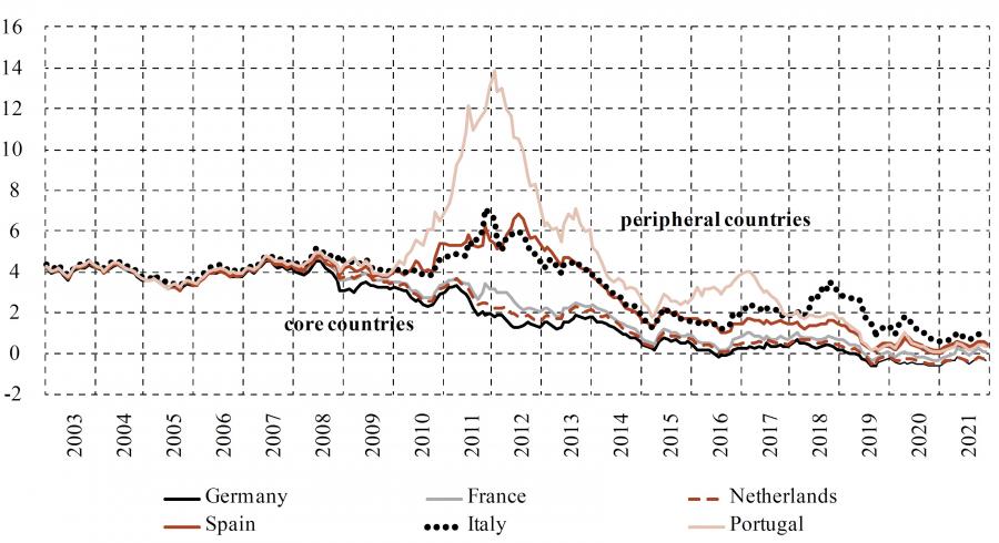 The pass-through of the ECB’s policy measures to financial markets was smooth and strong. For example, as shown in figure 2, euro area governments saw a substantial reduction in borrowing costs when the debt crisis had ended, and particularly after the ECB’s decision in March 2015 to launch a major bond buying scheme – the Asset Purchase Programme (APP). By purchasing long-term government bonds in large quantities, the Eurosystem central banks caused the term premium on these bonds to narrow, resulting in a sharp drop in bond yields (Eser et al., 2019). In such an environment, Germany, France and several other advanced euro area member states saw their 10-year government bond yields fall below zero for the first time in history. In order to secure long-term gains from such favourable financing conditions, member states’ governments took measures to extend the average maturity of their debts, so that the benefits of exceptionally low interest rates would be felt also in the future (Plessen-Mátyás, Kaufmann and Landesberger, 2021).