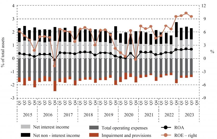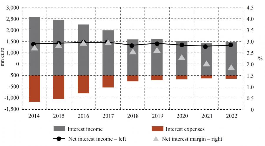 Figure 6Croatian banks’ net interest income and margin DISPLAY Figure To summarize, the environment of very low interest rates was challenging for euro area banks, as it weighed on net interest margins, their main source of profits. As shown in the next section, bank profitability indicators improved substantially following the sudden rise in inflation in the second half of 2021. In particular, given that persistently high inflation prompted the ECB to shift from a highly expansionary to an increasingly tight monetary policy, banks began to see a sharp increase in their interest income, which enabled them to enjoy record-high, if temporary, returns on equity.
