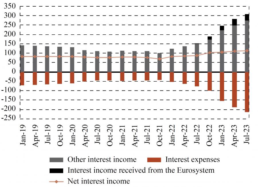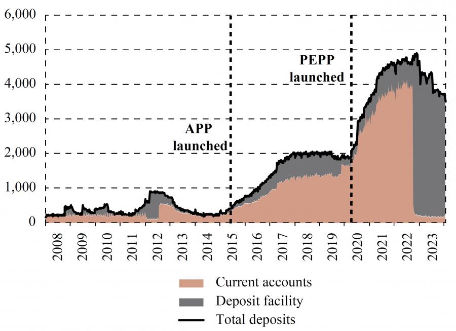 As noted above, following the sovereign debt crisis, the ECB maintained a highly accommodative monetary policy in order to counter deflationary pressures and support economic recovery (figure 9). The most noticeable effect of this policy was the injection of a considerable amount of central bank reserves into the banking system, due to which deposits of euro area banks with the Eurosystem increased from under 200 billion euro at the end of 2014 to more than 4.5 trillion euro in early 2022 (figure 10).Figure 9Composition of the Eurosystem’s total consolidated assets (bn euro) DISPLAY Figure Figure 10Size and composition of banks’ deposits with the Eurosystem (bn euro) DISPLAY Figure These large holdings of reserves enabled banks to start earning substantial risk-free interest income immediately after the ECB brought its key policy rate into positive territory in response to high inflation. As shown in figure 10, before the ECB embarked on its tightening cycle in the summer of 2022, banks kept most of excess reserves in their current accounts. There was no incentive for banks to put their money in the deposit facility because the same negative rate was applied to the deposit facility and current accounts. However, in July 2022, the ECB raised the deposit facility rate from -0.5% to 0%, and further to 0.75% in September of that year. In order to take advantage of the positive interest rate, within only a few days in mid-September euro area banks reallocated trillions of euros from their current accounts to the deposit facility (figure 10). At that point, the large excess reserves became a major source of interest income for banks. The ECB kept increasing the interest rate on the deposit facility until it reached 4% in September 2023.