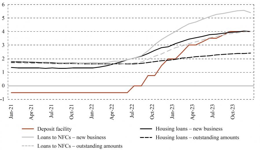 6 On the other hand, it can be economically reasonable to issue a long-term loan with a fixed interest rate below the deposit facility rate if the lender expects the deposit facility rate to fall during the repayment of the loan. Indeed, in some euro area member states, interest rates on new housing loans remained below the deposit facility rate throughout the monetary policy tightening cycle.