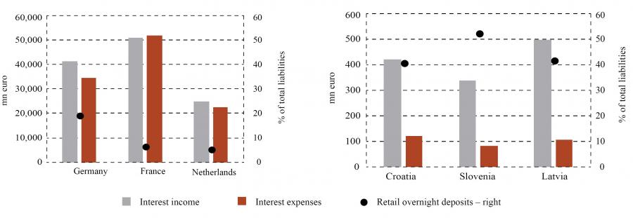 Figure 18Cumulative increase in interest rates on outstanding private sector loans* DISPLAY Figure Figure 19Contributions to the overall increase in gross interest income* (in %) DISPLAY Figure Croatia, on the other hand, was among the countries with the weakest transmission of ECB policy rate hikes to lending rates. 8 Despite this, Croatian banks recorded a marked widening of their net interest margins, supported by substantial interest income earned on their large stocks of excess reserves and the fact that interest expenses grew more slowly, reflecting the high share of cheap overnight deposits in their total liabilities (figures 19 and 20). The same applies to Slovenian banks, which also benefited from a combination of abundant excess reserves and the dominance of overnight deposits as a source of funding. German and Dutch banks, in contrast, saw a much milder improvement in their net interest margins, while French banks experienced a fall in their interest margins. The main reason why these banks benefited less from higher interest rates than banks from other countries is that in these advanced banking systems retail overnight deposits – which respond very slowly to central bank policy rate changes – account for only a small fraction of total liabilities (figure 20). Therefore, when the ECB began to tighten its monetary policy, their cost of financing increased sharply in line with interest income, which in turn prevented a stronger widening in their net interest margins.