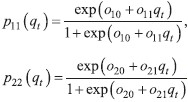 Transitional probabilities pij depend on the observable variable qt based on the logistic function of the following form:  | (9) |