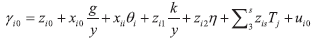This paper applies the model in Devarajan, Swaroop and Zou ( 1996) to public investment data. Thus, in the matrix expression in equation (5), θen represents the share of energy infrastructure, θt&c, transportation and communication, θed, education, θhe, health, θc&s, city infrastructure and security, in total public investment. The other variables in the regression model in this paper are:  the share of total public investment in GDP, to control for the change in the sum of all components of public investment;  , the share of private capital in GDP in the manufacturing sector, to control for private sector investment; η, population growth rate, to control for the change in the population size in the provinces; and Tj, a dummy variable for each year in the dataset, to control for the cross-sectional fixed-effects. γ is the dependent variable, which is the five-year forward-moving geometric average of per-worker real GDP growth rate. zi0 is the constant term and ui0 is the error term.