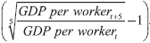 In the empirical analysis, public investment in year t is expected to impact the growth rates between years t + 1 and t + 5. Thus, the dependent variable is defined as the five-year forward-moving geometric average of per-worker real GDP growth rate using the formula,  The reason for using the five-year forward-moving geometric average of per-worker real GDP growth rate is discussed in more detail in the next section.
