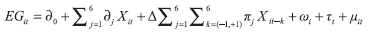 where Δ is the first difference operator, and ∂j are long-run coefficients of exogenous variables that need to be estimated. First differences are included to control for time-invariant, country-specific factors. The leads and lags are introduced to address potential issues with autocorrelation and endogeneity of variables.