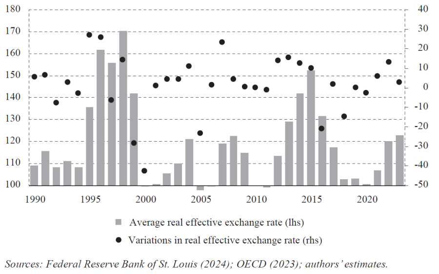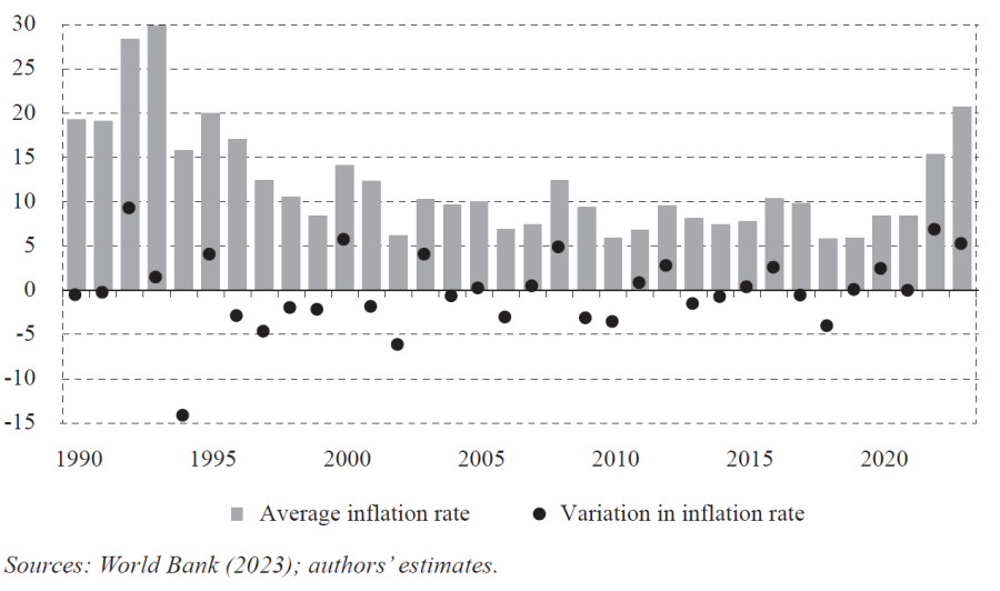 Real depreciation has been accompanied by high inflation, averaging over 20% per year from 1990 to 1996, and about 10% from 1997 to 2021 (graph 3). Like elsewhere around the world, the pandemic led to a surge in inflation in 2022-23. The annual variations show the patchy record of bringing down inflation from the mid-1990s to the early 2020s: many years saw disinflation, but such efforts could not be sustained and average inflation often rebounded in subsequent years. In addition to currency weakness, persistent inflationary pressures have been attributed to supply shocks in agriculture, high production costs, and fiscal expansion (Nguyen et al., 2017).