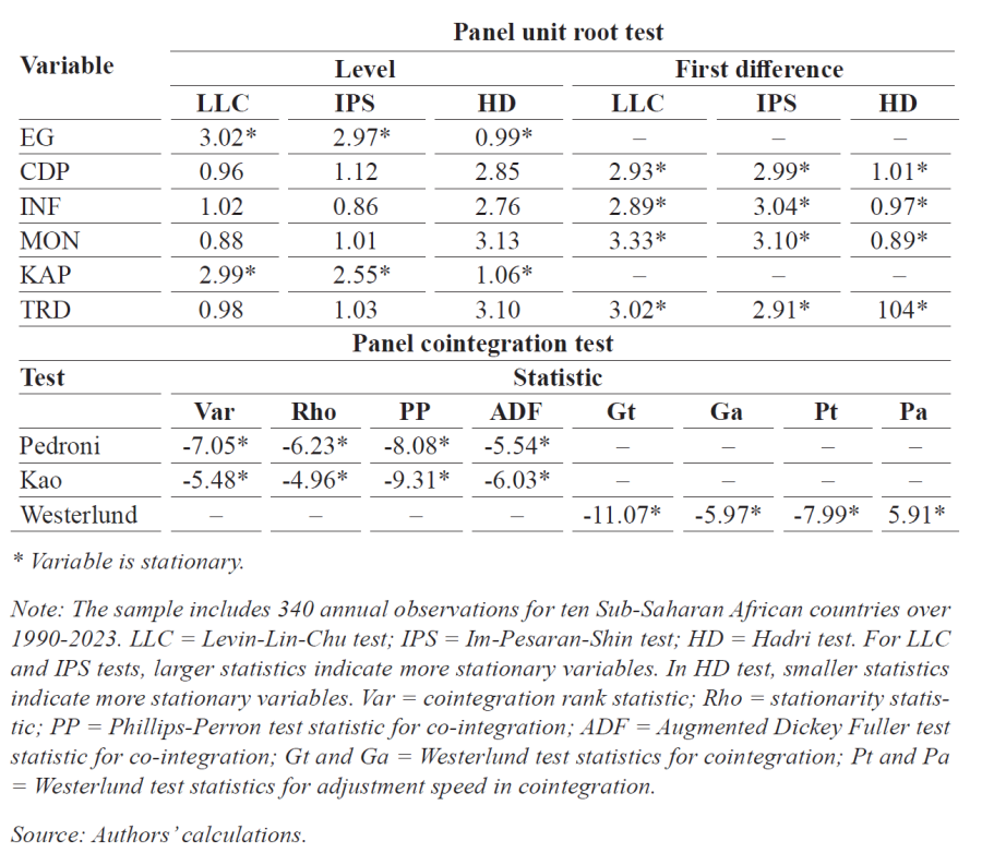 We perform standard preliminary tests to check that all variables in the model are stationary and co-integrated. The stationary tests are complemented with three unit-root tests: the Levin-Lin-Chu (LLC), Im-Pesaran-Shin (IPS), and Hadri (HD) tests. Co-integration between variables is assessed using Pedroni, Kao, and Westerlund tests as applied for instance in Andrei, Mieila and Panait ( 2017) and Taghizadeh-Hesary et al. ( 2019). Structural stability of the model is tested by employing the maximum likelihood technique proposed by Yu, Jong and Lee ( 2008), followed by a test of prediction capacity using the procedure adopted by Kuo ( 2016).