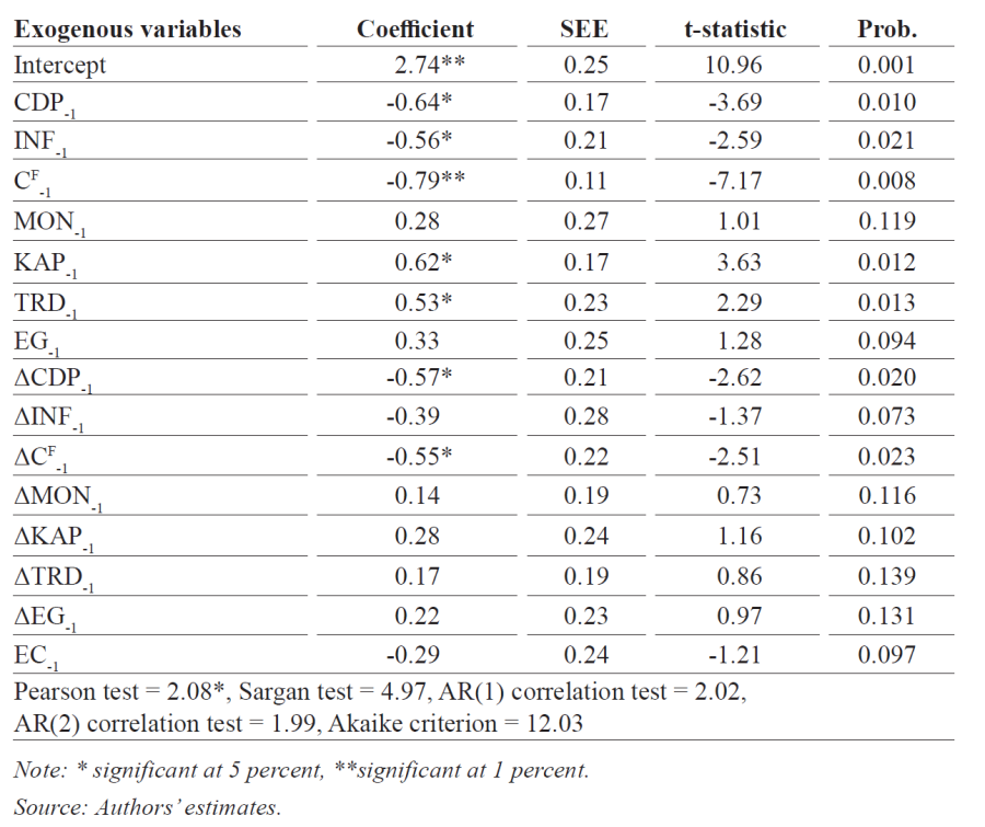 Equation (3) describes a long-run equilibrium relationship between economic growth and the set of selected explanatory variables. It is a specification dating back to Stock and Watson ( 1993) that is commonly used to analyse long-run relationships between endogenous and exogenous variables. We complement it with an error-correction model that describes short-run growth adjustment to shocks in explanatory variables: | (4) |