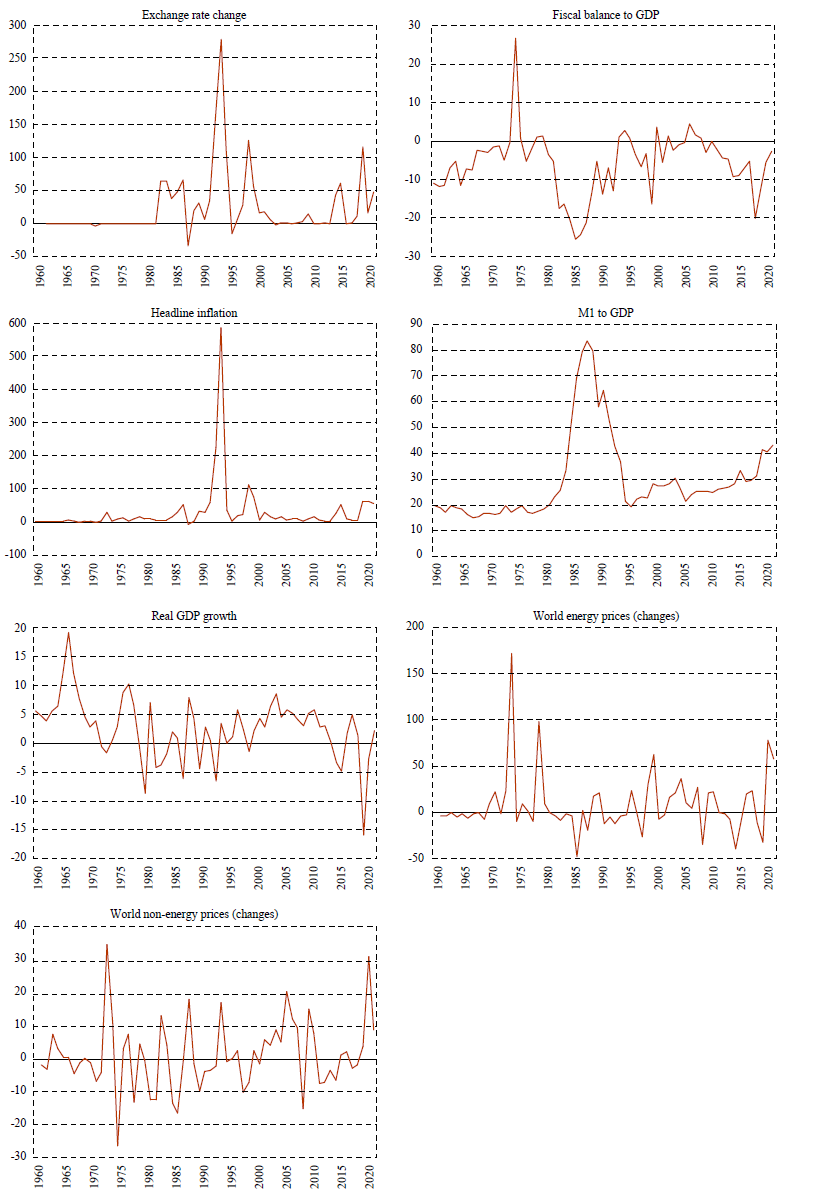 The empirical analysis is conducted with annual data between 1961 and 2022, primarily retrieved from the General Bureau of Statistics Suriname (GBS) and the Centrale Bank van Suriname (CBvS). I considered quarterly data, but an extensive time series of quarterly data is unavailable for some of the indicators used in the model, such as the fiscal balance and GDP. Figure 1 graphically presents the used indicators, while tables A1 and A2 in the appendix present the metadata and the descriptive statistics.