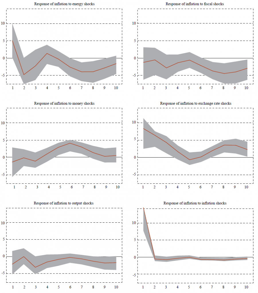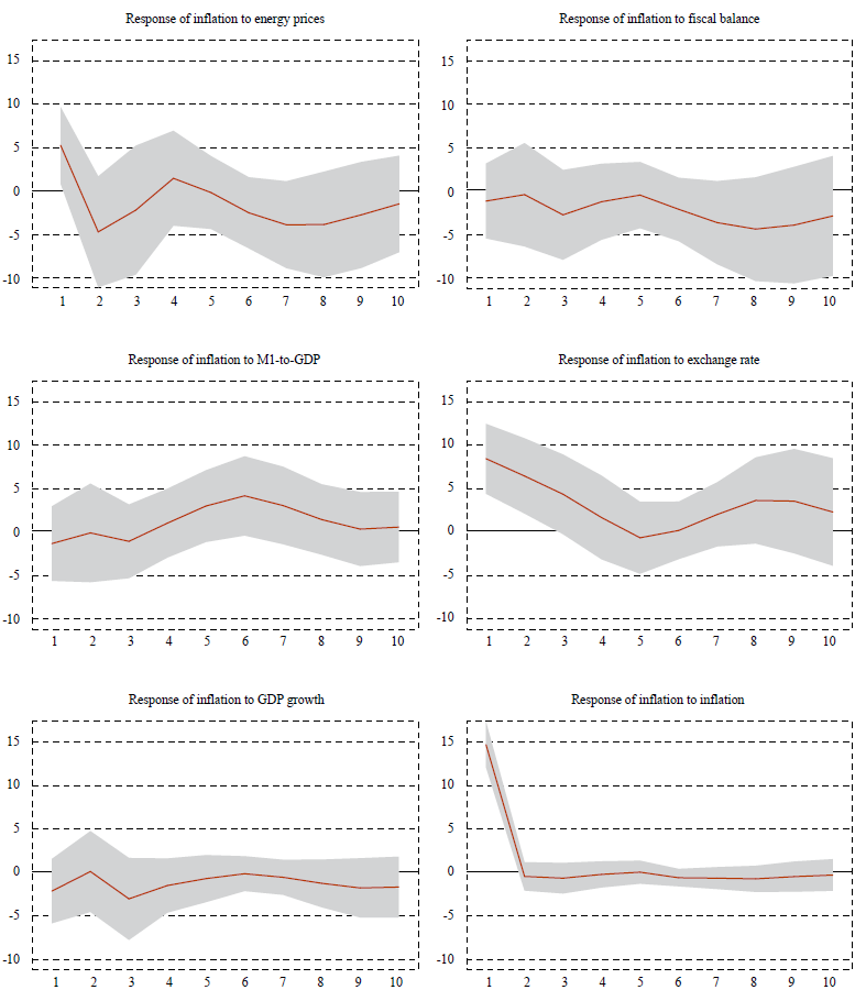 Impulse response functions are widely used to determine the impact of structural shocks in SVAR models. Primarily, this investigation focuses on the responses of inflation to shocks in the variables that entered the SVAR. The present impulse response analysis features one model that includes energy prices and one that includes non-energy prices as most exogenous variables. Figures 2 and 3 present the impulse responses of inflation6.