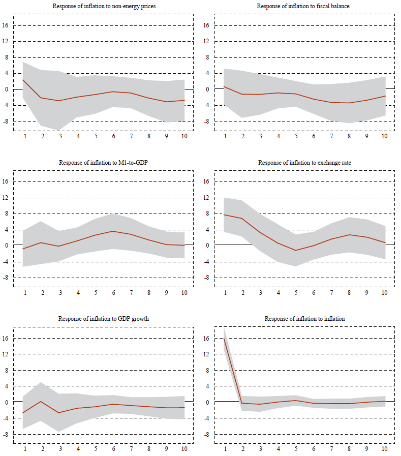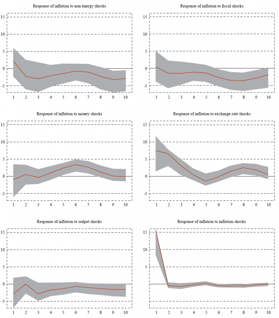 Bootstrap confidence intervals as proposed by Kilian ( 1998) could provide more reliable impulse response functions in the case of small sample sizes or when residuals are not normally distributed. These bias-corrected bootstrap confidence intervals explicitly take into account the bias and skewness of the impulse response estimators in small sample distribution. The bias-corrected confidence intervals (appendix, figures A2 and A3) point to a statistically significant impact of the exchange rate on inflation, in line with the results of the unadjusted confidence intervals. In contrast to the unadjusted confidence intervals, the bias-adjusted confidence intervals provide evidence that money supply shocks induce inflation, while commodity-price shocks lower inflation in the short run.