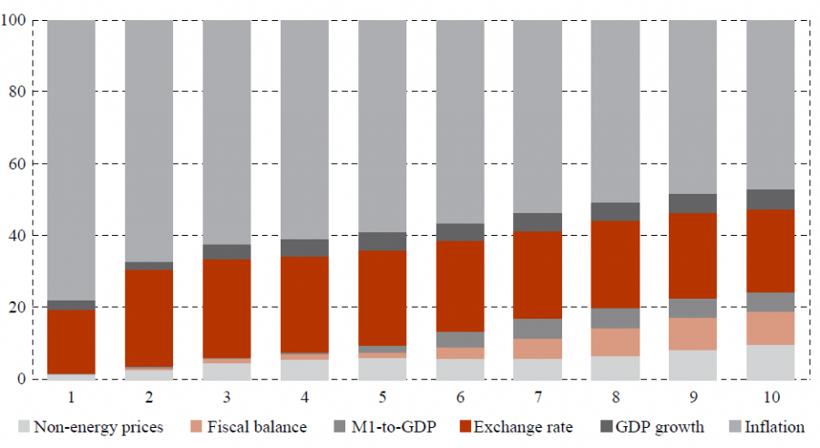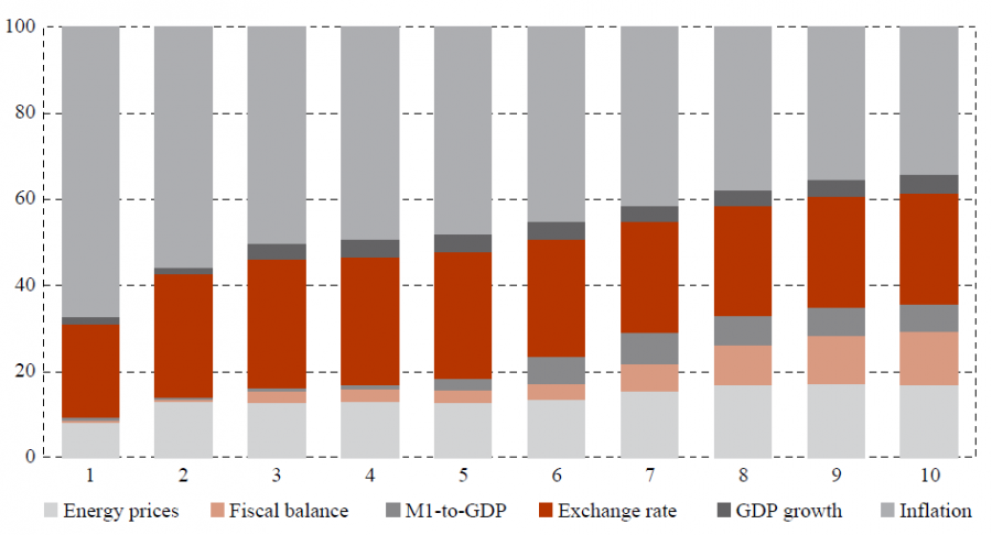 The variance decomposition analysis reveals that inflation persistence is prominent for explaining contemporaneous inflation (figures 4 and 5). However, as of t+1, the effect of the exchange rate and energy prices becomes more profound. In line with the findings of the impulse responses, variations in energy prices are more pronounced for variations in inflation compared to non-energy prices. The variation in inflation brought about by economic growth and the fiscal balance increases steadily over the medium run.Figure 4Variance decomposition of inflation: model with energy prices (in %) DISPLAY Figure Figure 5Variance decomposition of inflation: model with non-energy prices (in %) DISPLAY Figure
