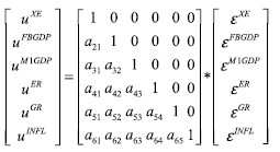 The empirical analysis uses a unit triangular A matrix. In the estimated SVAR, contemporaneous shocks are denoted by [uXE,uFBGDP,uM1GDP,uER,uGR,uINFL]', while structural shocks become [εXE,εFBGDP,εM1GDP,εER,εGR,eINFL]' based on the identified restrictions. The relationship between ut and εt can be stated as follows:  | (6) |