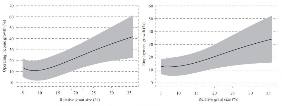 Figure 1Estimate of the relationship between grant size and impact level on trends in operating income (left) and total employment rate (right) DISPLAY Figure