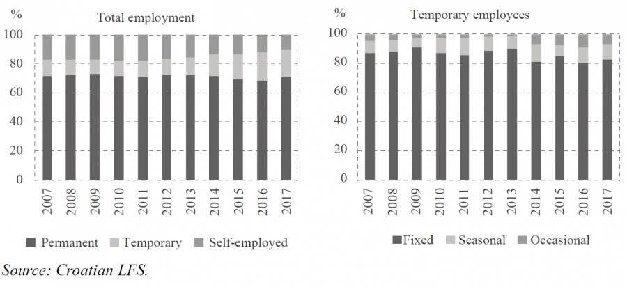 2 Matković ( 2013) finds that in the pre-crisis period temporary contracts were more frequently used in the peripheral part of the private sector for hiring young workers and low-skilled workers in routine manual and service occupations.