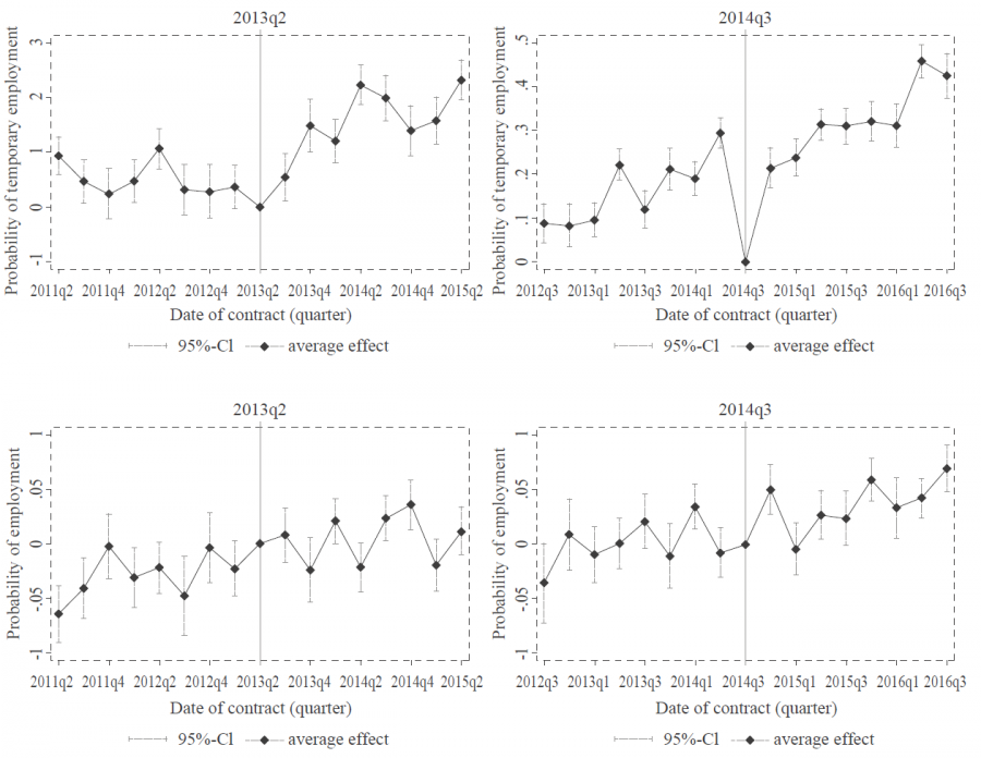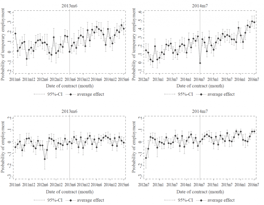 23 For example, the second reform dummy variable (August 2014-December 2017) also includes the ‘cumulative effect’ as the reform came in on top of the first (from June 2013) reform. In addition, the results of the reform variables modelled as dummies are presented here; however, using EPL indices (Table 1) instead of dummy variables gives qualitatively the same results (available upon request). Additionally, I have estimated all the models using linear probability regressions and the obtained results are much the same as those presented here (available upon request).