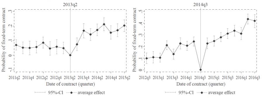 Second, it has been mentioned that the definition of temporary employment used in the previous models might be too broad when discussing the employment protection legislation reform(s). Therefore, I have also conducted an analysis restricted to fixed-term contracts as part of temporary employment. A graphical representation of the event study focusing on the incidence of fixed-term contracts is presented in Figure 6, while main regression results are available in Table 4.