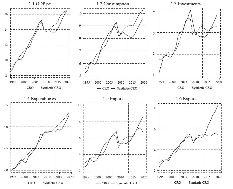 Note: The mutual movement is based on an index with a common base 2013=100. Changes after 2013 show the movement of the Croatian series and its estimated synthetic controls. Divergence between two lines is seen as changes that occurred after joining the EU. Source: Author’s calculation based on results of synthetic control method estimations.