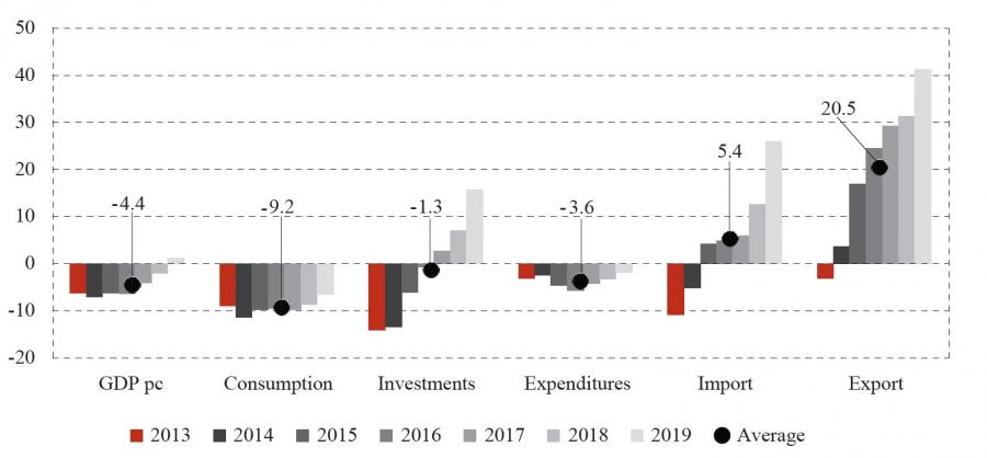 Figure 7 shows the results related to labour productivity expressed as a ratio of GDP per employee, and sectoral productivity of industry, agriculture and services measured by per capita value added of a particular sector. It is immediately noticeable that in each figure the line of the real Croatia is below the line of the synthetic series for Croatia, i.e., that deviations are present. The labour productivity (figure 7.1) of synthetic Croatia follows well the real movement of Croatia in the pre-EU period. It can be seen from the figure that after 2013 a stronger and more persistent divergence was observed with a 4% average decline in labour productivity (figure 8). In the post-EU period, a stronger one-off decline in real labour productivity is noticeable immediately after 2013 lasting one year when productivity takes on an upward trend. Such a one-off decline caused further persistent deviations that did not decrease until 2019 without a clearly visible tendency for the gap to be closed and for mutual convergence to be achieved in the medium term.