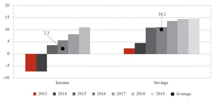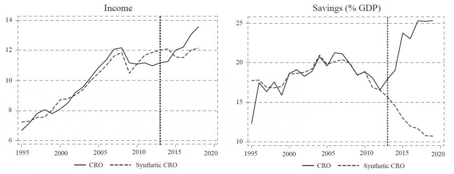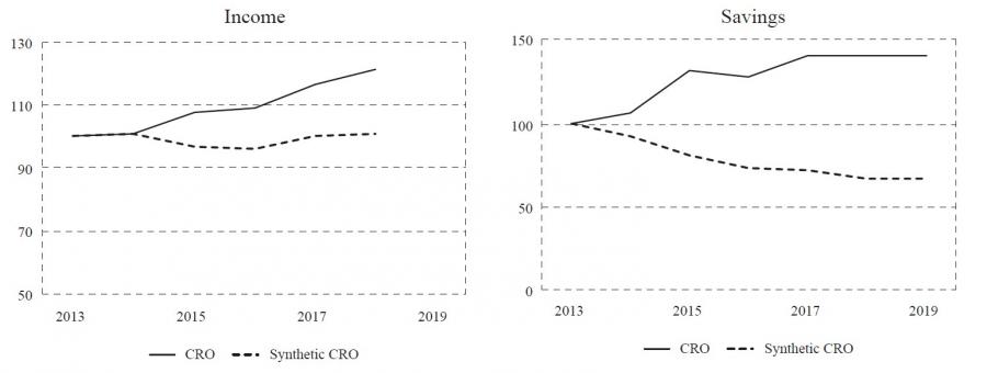 Note: Income was originally modelled in absolute terms (constant 2010 US$) and it is graphically expressed as the percentage difference between real and synthetic value, where a positive (negative) value indicates that the real series is greater than (smaller than) the synthetic series by that percentage. Savings were originally expressed in percentage of GDP and graphically expressed as the simple difference between the real and synthetic value. Source: Author’s calculation based on results of synthetic control method estimations.