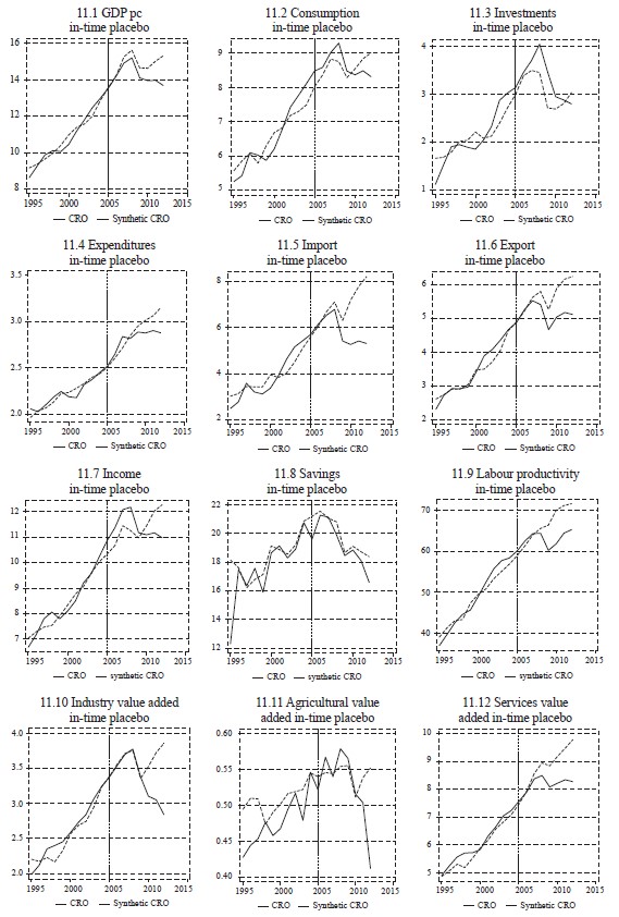 Finally, robustness testing is examined by using a difference in differences (DID) approach which estimates average changes over time in the outcome variable of a treated unit relative to average changes in the same variable of an untreated unit. The linear parametric form, the method of ordinary least squares, is most often used as a method of estimating DID and associated standard errors. In relation to SCM, which provides dynamic analysis, estimation via DID is based exclusively on static inference and in this paper is used exclusively as a supplement to SCM estimates in robustness testing procedures. With the use of the DID method it is not possible to record accurately how the effect of Croatia’s accession to the EU changes through time, but it can serve as a tool for additional control of the findings obtained using the synthetic control method (for more about the DID method, limitations, and methods for solving certain DID problems please see: Card and Krueger, 1994; Bertrand, Duflo and Mullainathan, 2001; Abadie, 2005).