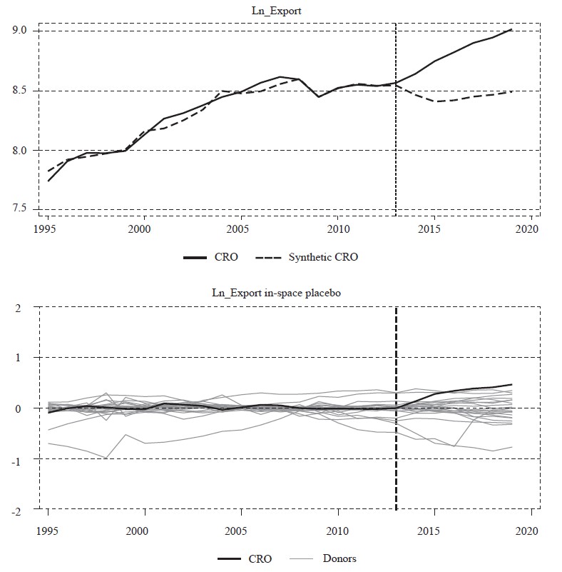 The robustness control by the DID method mainly confirmed our primary conclusions regarding the application of SCM with calculate average changes. However, attention should be paid to the negative coefficient for exports, which showed a positive time effect in the dynamic analysis for SCM. The observed discrepancy in export results can be partly explained by the average changes in the value of exports which are taken into account when estimating using the DID method. Also, the DID estimate takes in all sample countries regardless of missing data, which can lead to certain methodological discrepancies. The average changes (increase) in exports in some countries in the sample may thus reflect a larger increase in exports compared to Croatian exports as well as trend differences, which is ultimately reflected in the obtained results. The appearance of a negative coefficient in exports could primarily be caused by methodological problems that can be found in the application of the DID methodology. Due to the sensitiveness of the application of the DID method, for additional security, an additional SCM assessment of exports (on logarithmic values) was made, which confirmed the stronger robustness of export performance throughout the entire period. The results are in figure A1 in the appendix.