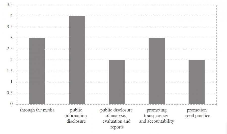Graph 1 shows a comparison of the distribution of ratings for the question of howfiscal councils influence transparency and the accountability of politicians for the management of public finances. The results show that four out of 14 councils evaluate “public information disclosure” as the best way to influence the transparency and accountability of politicians in managing public finances. This was followed by “communication through the media” and “promotion of transparency and accountability”. Two councils each highlighted “public disclosure of analysis, evaluation and reports” and “promoting good practice through transparency in the work of fiscal council”.