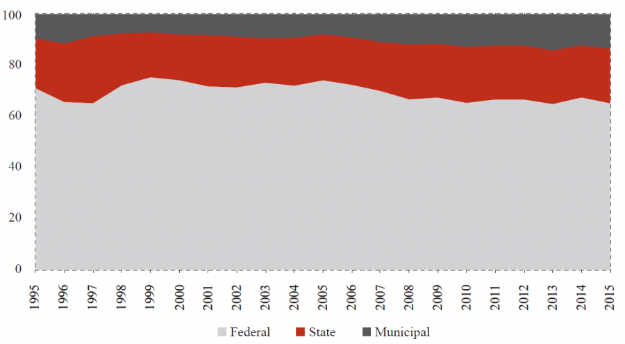 Figure 2Expenditure per level of the Brazilian government, 1995-2015, by percentage DISPLAY Figure
