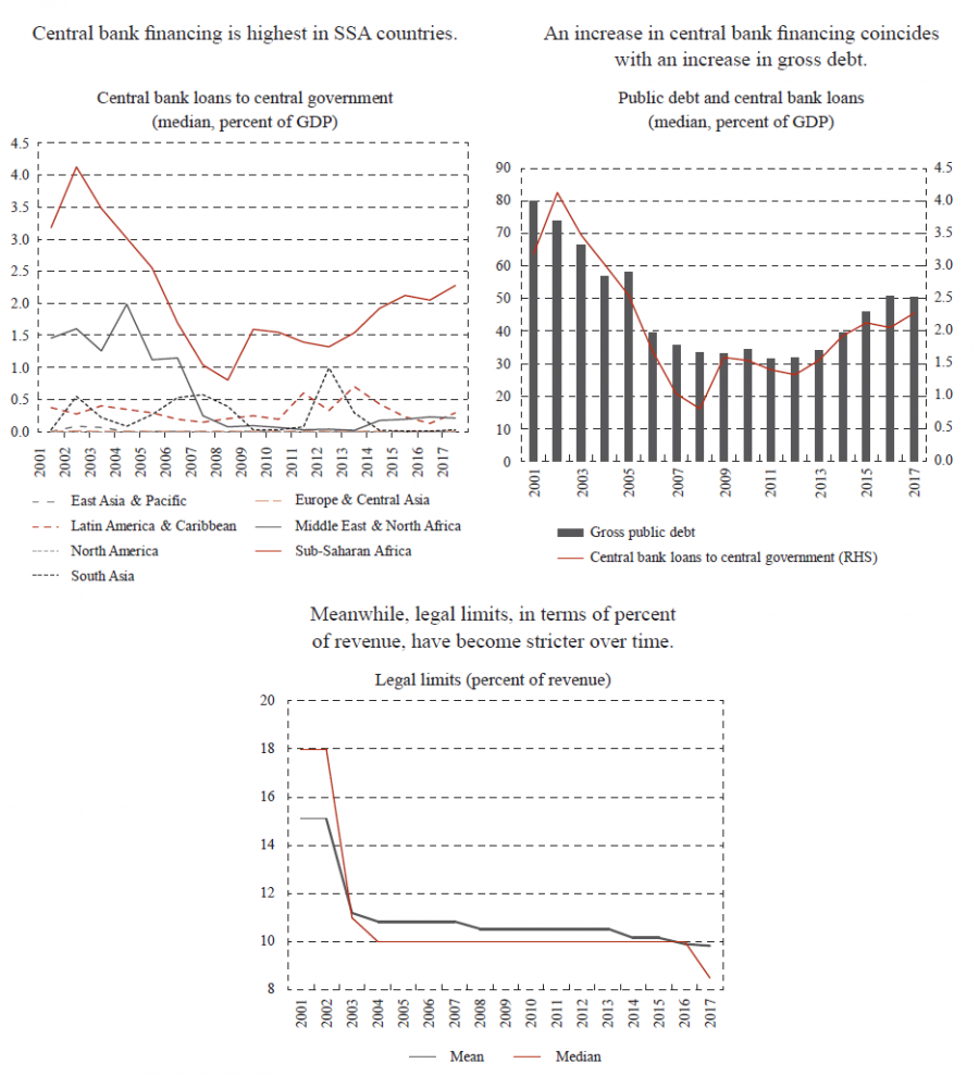 This paper therefore looks at what lessons can be drawn from sub-Saharan Africa, a region where government financing by central banks was common even before the Covid-19 crisis. It attempts to answer three main questions: First, what is the evidence for central bank lending to government in practice and how does it relate to legal limits? We construct a new database of quantitative legal limits and compare these with the actual level of lending. Second, why do governments choose to finance deficits through central bank borrowing? We empirically estimate the impact of factors such as the availability of outside financing options and whether legal limits are binding in practice. Third, should we care? We attempt to identify the macroeconomic impacts of fiscal dominance on monetary aggregates, the exchange rate, and inflation.