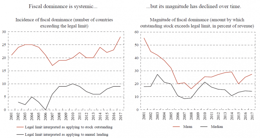 Fact 4. Fiscal dominance has declined over time, despite the tightening of legal limits. Central bank lending above the legal limit (what we call “fiscal dominance”) appears to be a systemic phenomenon in SSA. 11 In 2017, lending exceeded the limit in between 9 and 29 countries (out of 41 countries) depending on whether the legal limit is interpreted as applying to the outstanding stock or the flow of lending (figure 3). 12 Noncompliance (or the incidence of fiscal dominance) is more common for those with stricter limits (i.e., legal limits are interpreted as applied to the stock of loans outstanding), most likely because some central banks are carrying legacy loans from the past. Nevertheless, the amount by which central bank lending exceeds legal limits (or the magnitude of fiscal dominance) has fallen, despite the tightening in limits.