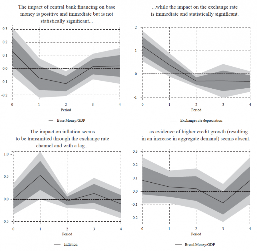 The results of the IRFs are economically intuitive and some are statistically significant. The precision of the estimations is affected by the large variation in our variables of interest (table 3). So, while the impact of central bank financing on base money is positive and contemporaneous, no statistical significance is observed. On the other hand, the impact on the exchange rate is contemporaneous and statistically significant. An increase in central bank credit to the government by one percentage point of GDP – or about five percentage points of revenue on average – is associated with a depreciation of the exchange rate by one percentage point contemporaneously. The impact on inflation seems to show with a lag. The same increase in central bank credit to the government is associated with an increase in inflation by half a percentage point a year later. Moreover, the impact on inflation seems to be transmitted mostly through the exchange rate channel as the evidence of credit growth (resulting in an increase in aggregate demand) seems absent (figure 4).