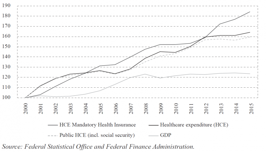 Healthcare expenditure (HCE) in Switzerland has more than doubled over the last half-century or so, rising from 5.2% of GDP in 1960 to 12.1% of GDP in 2015. While the annual average growth rate of GDP per capita amounted to 1.5%, HCE per capita grew at a rate of 3.4%. A decomposition of HCE by funding source shows that public finances and, in particular, the expenditure of the mandatory healthcare insurance (MHI) have come under increasing pressure from the rise of HCE (see figure 2).