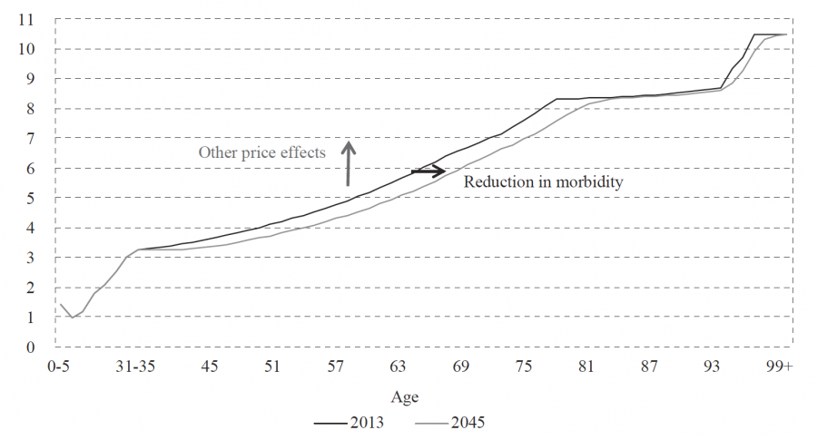 4 There are a number of indications to the effect that the expenditure profile steepens with time, and that the age cohorts are therefore affected to different degrees by the cost pressure of non-demographic cost drivers such as advances in medical technology (Gregersen, 2014). This could imply, for example, that research efforts to develop new medications are particularly focused on medications for the older age cohorts, as old people are disproportionately affected by serious illnesses such as cancer and cardiovascular disease.