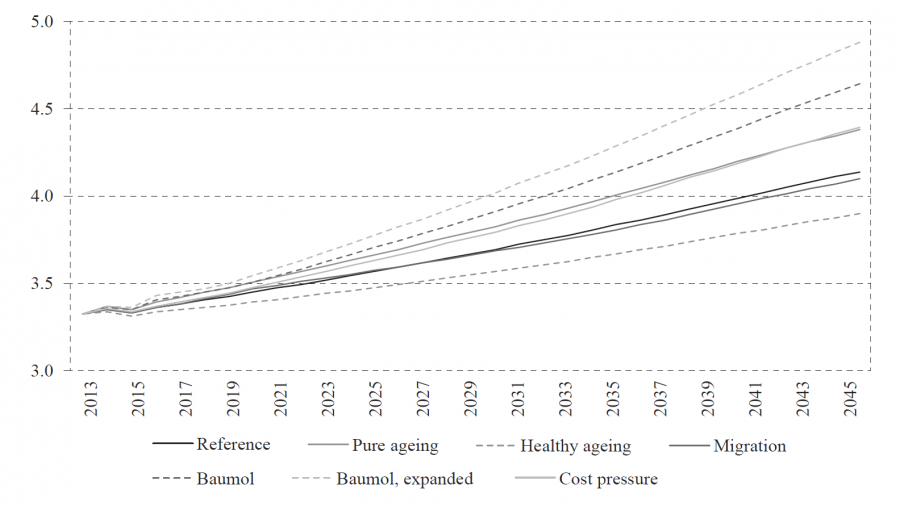 According to the “Reference scenario”, expenditure will continue to rise from 10.8% of GDP in 2013 to 14.0% of GDP in 2045 (see figure 4). For the years 1995 to 2013, health expenditure rose by around 2 percentage points of GDP (whereby GDP is cyclically adjusted). The average annual growth rate of total HCE amounted to 3.7%. What is striking is that the annual growth rate of expenditure on LTC from the age of 65 outpaced expenditure on HeL by over 1 percentage point, i.e. 4.8% vs. 3.6%.