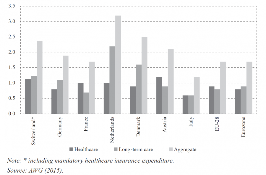 The increase in public HCE including MHI by 2.4% of GDP works out higher in Switzerland than the average increase of the EU-28 and the Eurozone with 1.7% of GDP respectively (see figure 7). In both sectors, HeL and LTC from the age of 65 the expenditure increase in Switzerland outlast the one in the Eurozone by 0.3% of GDP. The growth of public HCE including MHI is higher than in Germany, and puts Switzerland between Austria and Denmark. The comparatively lower increase of public HCE in EU countries may be explained by the fact that EU AWG assumes that the income elasticity in HeL initially starts at 1.1 but converges to 1.0 and that only a proportion of LTC services is affected by Baumol’s cost disease. In contrast, we assume a constant income elasticity of 1.1 and a full Baumol effect. Additionally, one should bear in mind that country-specific demographic scenarios, the expenditure profiles in the base year and the national healthcare systems differ.
