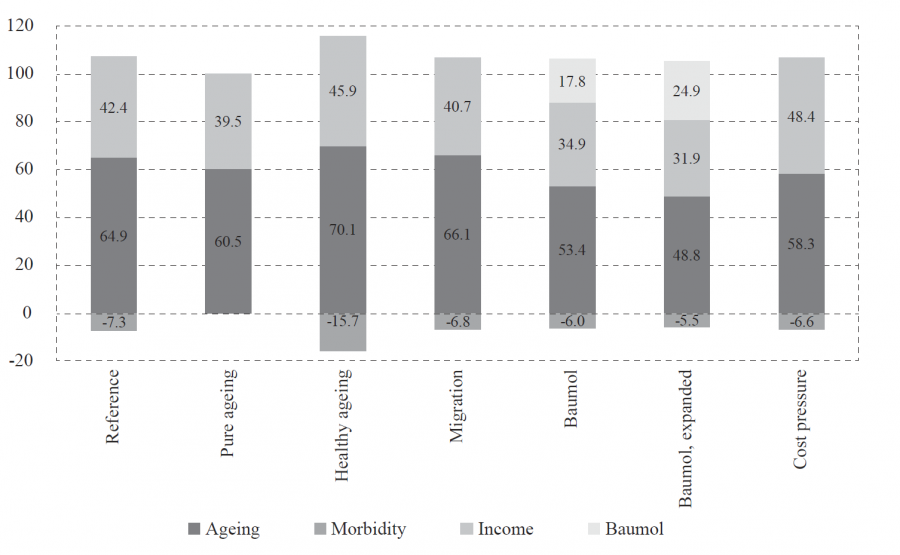 According to the “Reference scenario”, the trend towards significantly higher expenditure growth for long-term care (from 65 years of age) than for healthcare excluding long-term care will continue in the future. Measured as a percentage of GDP, expenditure on long-term care (from the age of 65) more than doubles (rising from 1.6% to 3.4% of GDP), while healthcare expenditure rises from 8.6% to 9.9%. On the one hand, demographic change (ageing, including the associated change in the average state of health) feeds through into the long-term care sector to a much greater extent (72% of the rise in expenditure) than it does in the remaining healthcare sector (just under 60% of the rise in expenditure). 6 On the other hand, expenditure on long-term care rises by 2.2% annually as a result of the Baumol effect, whereas expenditure on healthcare as a result of rising income per capita rises by just under 1.9% annually.