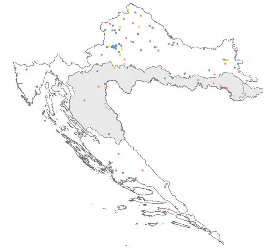 In order to analyze the long-run persistence of the Military Frontier in modern-day institutions, we use all three waves of the LiTS collected by the European Bank for Reconstruction and Development (EBRD) in 2006, 2010, and in 2016. LiTS records attitudes, opinions and values in post-transition countries. In particular, the first wave (2006) assessed public attitudes, well-being and the impact of economic and political change; the second wave (2010) dealt mostly with the effects of the financial crisis; while the last wave from 2016 explored life satisfaction, corruption, and gender gaps in the labor market and business. The covariates in LiTS are observed at the individual level and they include information on the respondents’ age, gender, education, religion, labor market status, household size, number of children under age 14, and – most importantly – location of residence. Figure 2 displays the location of respondents in the three LiTS waves differentiating them by colors. The shaded area represents the former Military Frontier. We restrict the analysis to modern-day Croatia because the Croatian and Slavonian districts represent the longest-lasting Military Frontier, persisting for 359 years. The part of the Slavonian district in the far east (Eastern Syrmium) is left out from the analysis because the area came under the territory of the Socialist Republic of Serbia in 1945. For each location in our dataset, we provide corresponding geographic longitudes and latitudes together with information on affiliation with the Military Frontier using Regan and Kaniški ( 2003 ). A geographic information system (GIS) is used to geocode location data in order to compute distances between locations and distances to the Military Frontier border, enabling us to take different subsamples of respondents around a specified distance from the border.