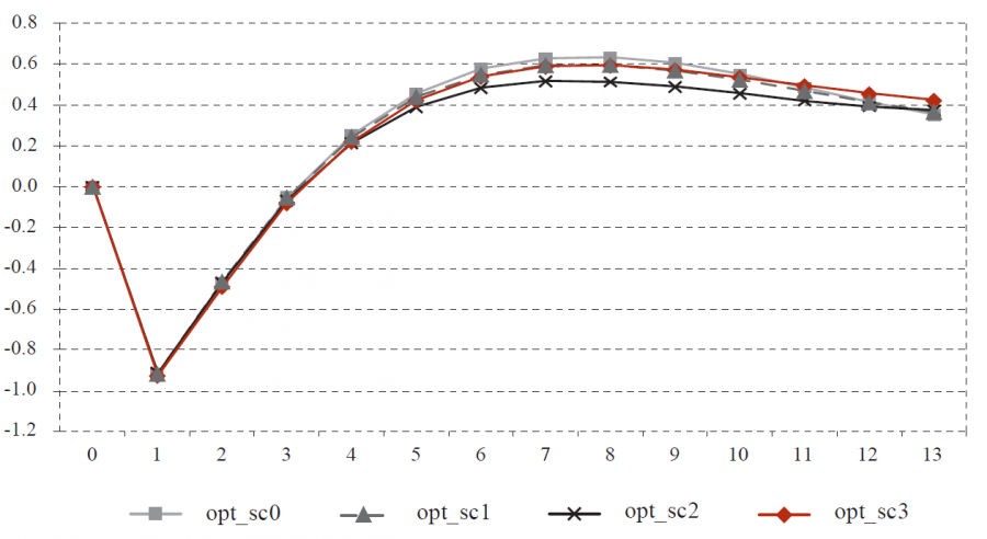 More information can be obtained from a detailed inspection of the results. Graphs 2-7 show the time paths of the deviations of some key target variables (graphs 2-6) and one instrument variable (graph 7) from their assumed “ideal” paths (which were not changed in the optimisation experiments). They show that the paths of the (endogenous) target variables are mostly close to their “ideal” paths while the reverse is true for the instrument variables (graph 7; similar for the other instruments) resulting from the optimisation runs. In particular, the public-debt-to-GDP ratio (graph 4) is always closer to its “ideal” path in the scenarios using the policy preferences from our procedure (scenarios 1-3), although the budget balance is further away from its “ideal” path. These results show that a more active (countercyclical) use of fiscal policy instruments can lead to improvements in terms of the revealed objectives of the policy makers without intolerable side effects on public deficit and debt. In addition, other simulations have shown that a better combination of the instruments with a more active use of government investment and a more restrictive use of government consumption leads to a more favourable outcome in terms of the trade-off between GDP growth and fiscal stability (see Weyerstrass et al., 2020; Neck et al., 2021).