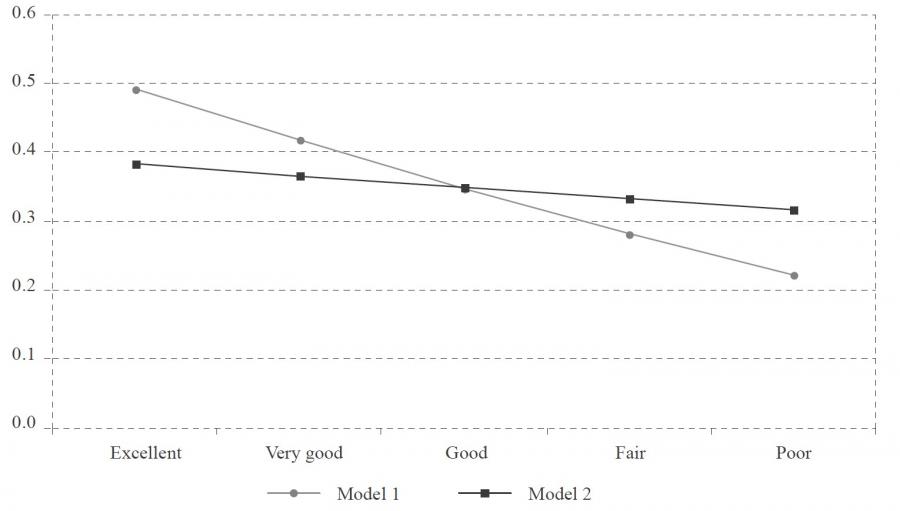In Figure 1, we compare the estimated probabilities of employment by SRH values for the two model specifications. Note that in Model 2, however, objective health indicators take on the role of SRH, which is only significant in Model 1.