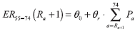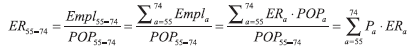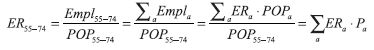 where  is the share of population of age a on the total of population aged 55-74;  is the employment rate at age α.