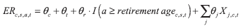 where θc is a country fixed effect, θr is the retirement age effect, Xj are a set of control variable variables of interest and θj their associated coefficients. Consequently, the employment rate of population is assumed to remain constant at  ntil the year before the retirement age when it falls by θr percentage points.