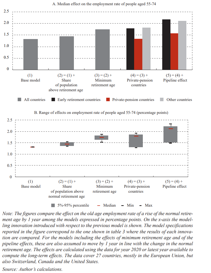 The innovations introduced by the present work produce much higher effects on the employment rate than implied by previous pooled country estimations, so that raising the normal retirement age is a much more worthwhile proposition for policymakers. The flexibility of the model better captures country-specificities of demography and pension systems, resulting in more heterogeneous predicted effects both across countries and through time. The model proposed, which distinguishes between minimum and normal retirement ages, enables simulations to be made on the impact of raising normal retirement ages and reducing the gap between normal and minimum retirement ages. In some countries with the lowest employment rates closing these gaps could lead to significant increases in employment rates. A few countries, in contrast, could reap substantial benefits by harmonising normal retirement ages between genders.