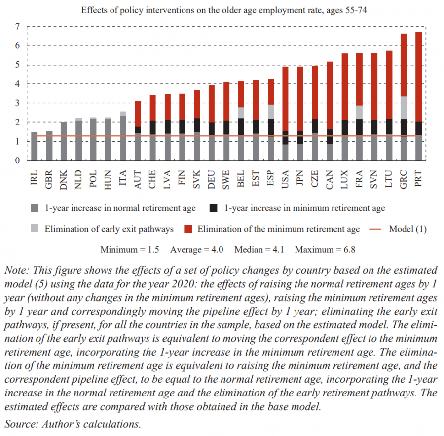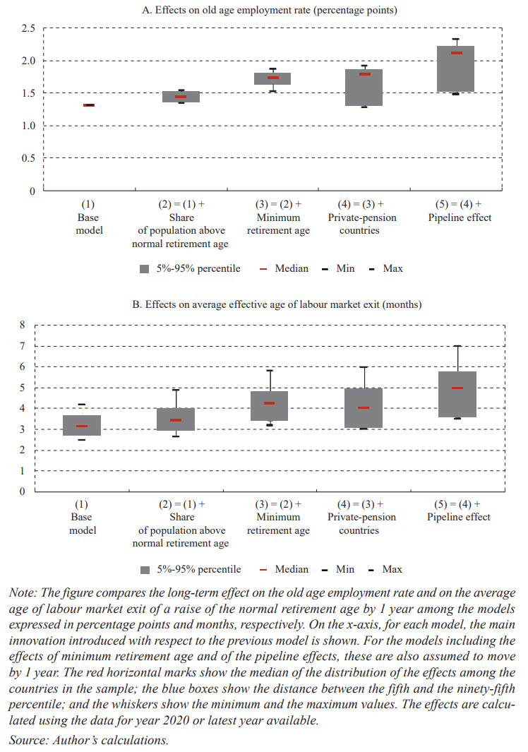- A 1-year increase in the minimum retirement age, keeping the full normal retirement age unchanged after the previous one-year increase. This effect is only relevant for countries that offer a minimum retirement age option. It further assumes the corresponding “pipeline effect” introduced in section 6 also shifts by one year.